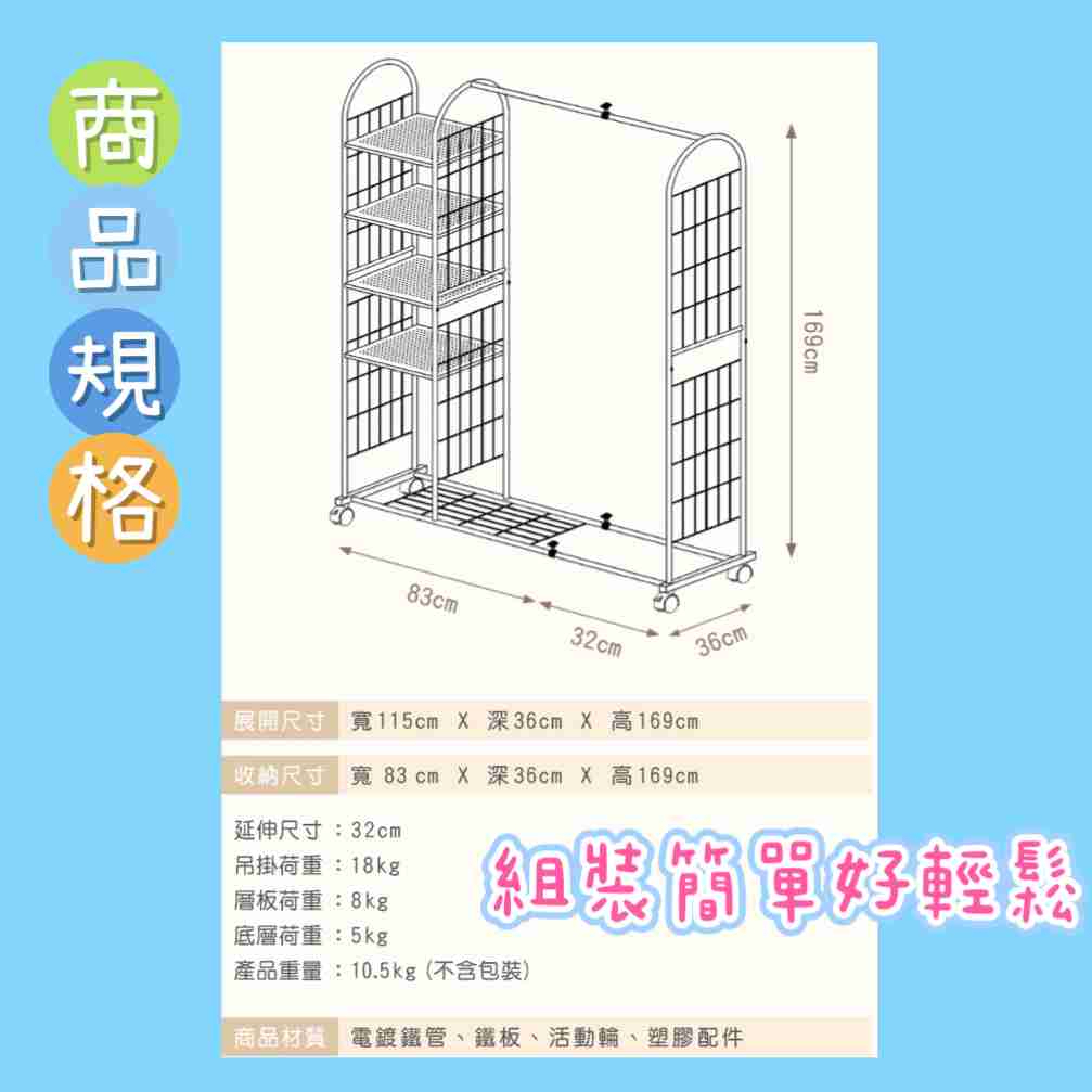 產品特色:金屬結構,支架穩固,適合各種衣物放置右邊吊衣服,吊衣桿擁有延展性,不怕不夠用左邊採金屬層板孔洞設計,可防止收納物品掉落下方網片做底,方便收納整理,使用自由度高穩固扎實的支撐,亮面電鍍加工,達到視覺效果一架收納,多層置物格+吊衣空間,居家大容量首選!圓弧設計:柔和圓潤邊角,讓空間和諧舒適,既安全又美觀。伸縮吊掛:超大掛衣量!隨時根據需求任意伸縮,增加吊掛空間。多層置物:衣物、日用品分層分類放置,收納空間更多。電鍍鐵管:電鍍防鏽處理,增強抗氧化,耐腐耐磨耐用。活動滾輪:二輪活動輪+二輪煞車輪,想放哪就放哪,移動方便好省力。商品規格:顏色:鉻色材質:電鍍鐵管+鐵板展開尺寸:115cm x 36cm x 169cm收納尺寸:83cm x 36cm x 169cm左右伸縮:約32CM吊掛荷重:8KG底部荷重:5KG內含:鐵管.鐵板.塑膠套.零配件重量:10.5KG±5%(不含包裝)產地:100%台灣製造,外銷美日韓需自行組裝(內附說明書)#組裝 #收納 #居家 #鐵架 #木板 #層架 #衣架 #衣櫃 #擺放 #組合櫃 #多功能 #變形 #曬衣架 #簡約現代 #房間#廚房 #客廳 #儲物