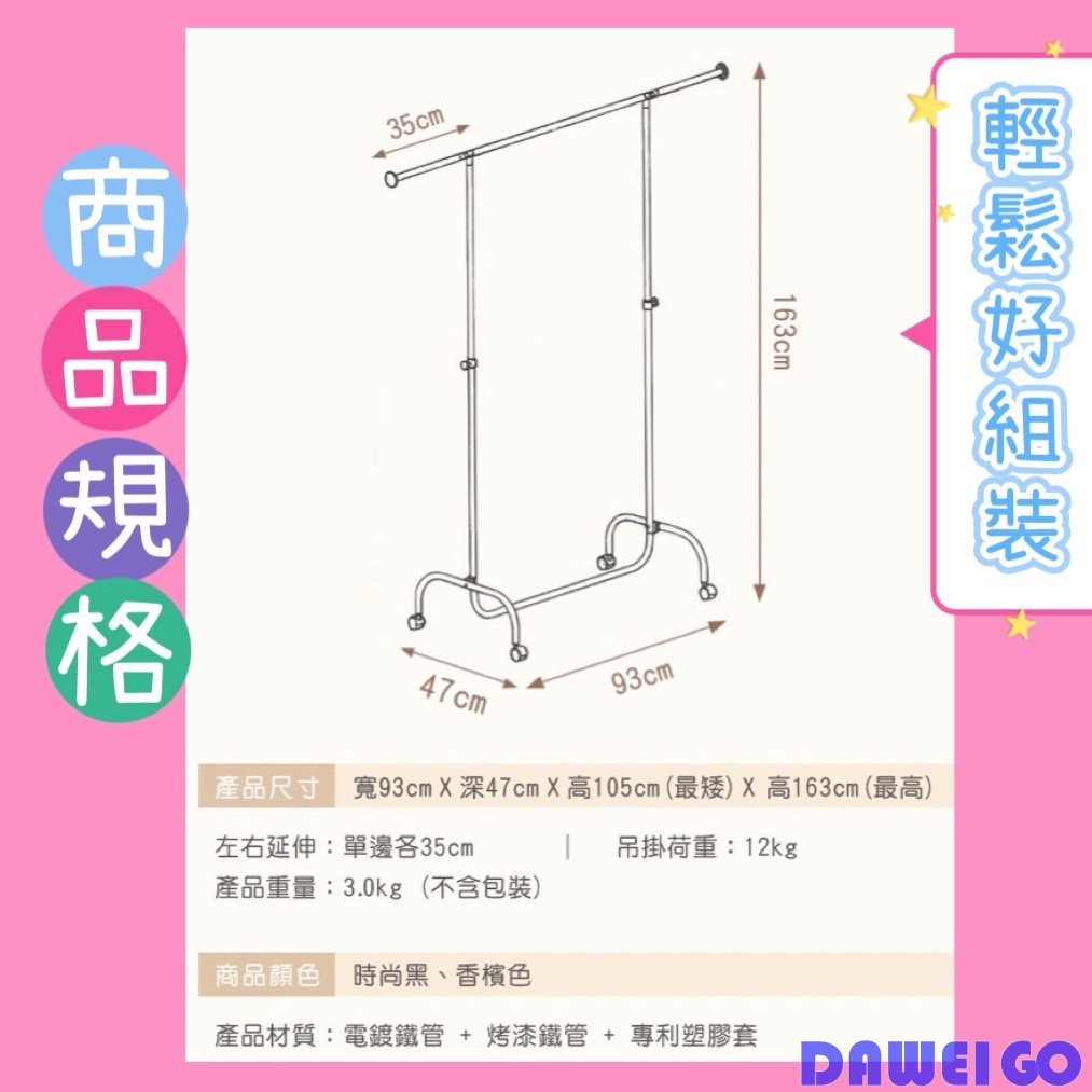 可能您也有這樣的煩惱:急著出門卻忘了衣服放在哪裡回家的時候衣服還要開櫃折疊衣服放在衣櫃裡面很久都沒拿出來穿那麼這款您值得參考日式單桿伸縮型曬衣架簡約美觀的日系曬衣架設計伸縮的衣架桿方便適配各種居家環境免螺絲設計輕鬆組裝直接就把喜歡的衣服放在眼前讓您不用再整天找不到衣服商品規格顏色:爵士黑 | 櫻花紅 | 天空藍 | 香檳色材質:鐵管+塑膠套組裝尺寸:93cm x 47cm x 163cm左右伸縮:各30CM內含:鐵管,塑膠套,零配件特色:輕鬆組裝,免螺絲設計,簡單掛衣好收納重量:3.0KG產地:100%台灣製造,外銷美日韓#臥室 #衣服 #吊衣架 #曬衣架 #鐵管 #多功能 #衣帽架 #雙桿 #乾淨 #整齊 #方便 #伸縮
